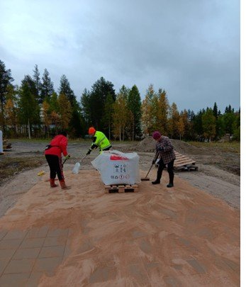 ”Hanke toteutettiin enimmäkseen talkoilla, joihin osallistui yhteensä parikymmentä henkilöä. Talkoita pidettiin viiden viikon ajan noin 700 tunnin edestä. Monelle tuli samalla tutuksi vaiheittain toteutettu maarakentaminen rakennekerroksia tekemällä ja tiivistämällä sekä lopuksi betonilaatoitusten asentaminen lämpöeristeen päälle. Talkoolaisia innosti erityisesti mahdollisuus kokeilla tärylätkän ajamista ensimmäistä kertaa. Kuntalaiset kokivat hankkeen ja siihen osallistumisen erittäin myönteisenä. Sokli Oy:n ja muiden paikallisten firmojen tuki edesauttoi matonpesupaikan valmistumista ilman suurempia vastoinkäymisiä”, Ahtinen toteaa.